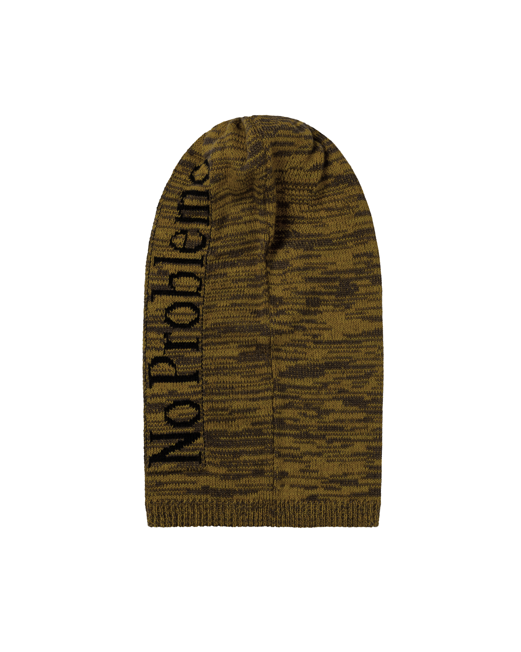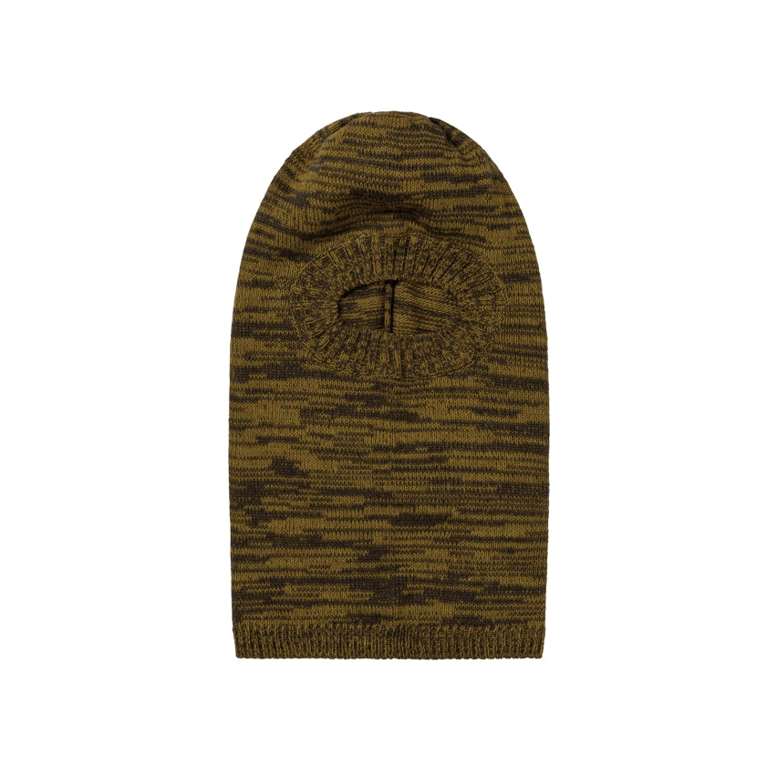 Knitted Balaclava made from cotton and recycled polyester yarn and an allover glitch-y knit jacquard design.